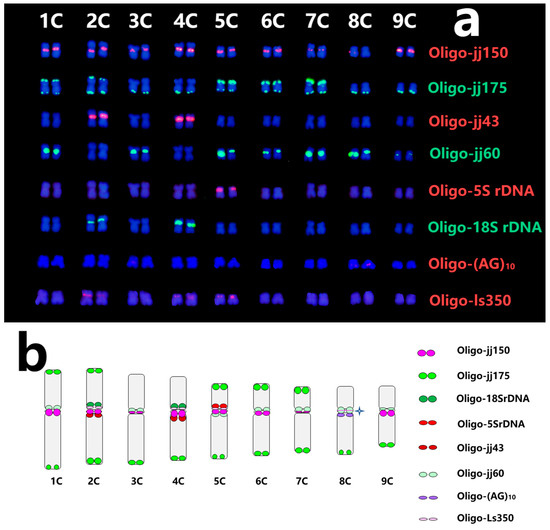 Nine pairs of chromosomes were assigned to the corresponding homology group using ND-FISH patterns and predicted physical locations with multiple probes. The standard karyotypes of C. intybus cv. Commander were established (Figure 3a). The hybridization patterns of various probes illustrated the ideogram of 1C to 9C chromosomes of C. intybus cv. Commander (Figure 3b). The centromeric and telomeric regions of nine chromosomes show a high density of hybridization sites. Meanwhile, the fluorescence intensity of one probe on different chromosomes was highly variable. For example, probe Oligo-jj60 produced strong hybridization signals on the centromeric region of 5C and 8C, which could not detect any signals on 2C and 4C.