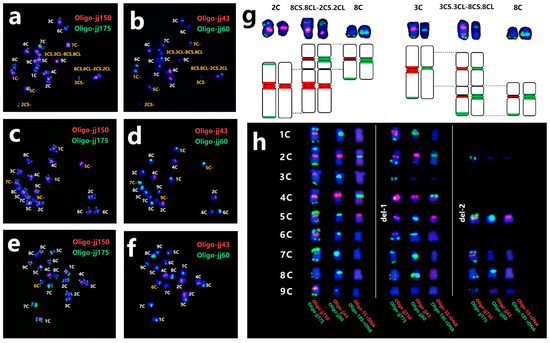 Sequential FISH karyotyping of root-tip cells from lines y64 (a,b), y61 (c,d), and y41 (e,f) revealed chromosomal aberrations. The probes were Oligo-jj150 + Oligo-jj175 (a,c,e), and Oligo-jj43 + Oligo-jj60 (b,d,f). The diagram indicates the rearranged chromosomes 8CS.8CL-2CS.2CL and 3CS.3CL-8CS.8CL (g). The probes were Oligo-jj150 + Oligo-jj175 (right) and Oligo-jj43 + Oligo-jj60 (left). The cut and pasted deletion chromosomes (h). The probes were Oligo-jj150 + Oligo-jj175, Oligo-jj43 + Oligo-jj60, and Oligo-5S rDNA + Oligo-18S rDNA from right to left, and the wild-type chromosomes (without deletions) are displayed on the left.