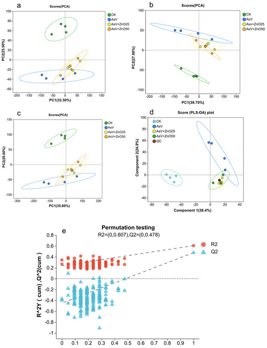 Two-dimensional principal component analysis (PCA) for the positive ion mode (a), negative ion mode (b), and a combined analysis of both modes (c). Partial least squares discriminant analysis (PLS-DA) score plots (d) and a permutation test (e) for the liquid chromatography–mass spectrometry (LC-MS) metabolic profiles of soybean roots subjected to treatments with 25 µmol L−1 AsV and ZnONPs at concentrations of 25 μmol L−1 (2.035 mg L−1) and 50 µmol L−1 (4.07 mg L−1). R2 and Q2 stand for model interpretability and model predictability respectively.