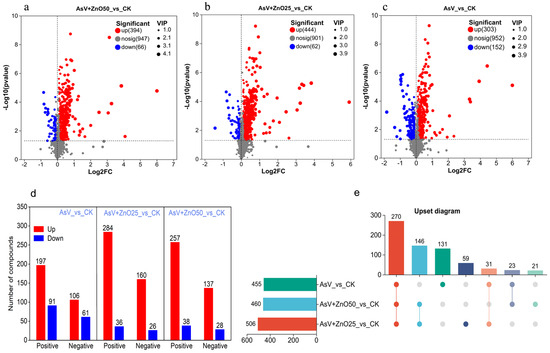 The metabolomics data from soybean roots treated with 25 μmol L−1 AsV and 25 μmol L−1 (2.034 mg L−1) and 50 μmol L−1 (4.07 μmol L−1) ZnONPs. The figure includes (a) a volcano plot of differentially regulated metabolites (DRMs) in the positive ion mode, (b) a volcano plot of DRMs in the negative ion mode, (c) a combined volcano plot of all DRMs, (d) a bar graph depicting the number of DRMs specifically regulated in either the positive or negative ion mode, and (e) an UpSet Venn diagram of DRMs. Each point in the plots represents a detected compound from the metabolomic dataset, with red and blue colors indicating up-regulated and down-regulated compounds, respectively, relative to the CK. The size of each point signifies the variable importance in projection (VIP) value.