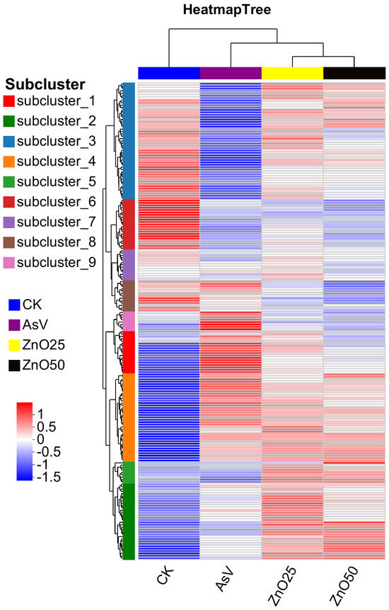 The k-means clustering analysis of the DAMs in the roots among different treatments. The treatment concentration was 25 µmol L−1 AsV and ZnONPs at concentrations of 25 µmol L−1 (2.035 mg L−1) and 50 µmol L−1 (4.07 mg L−1).