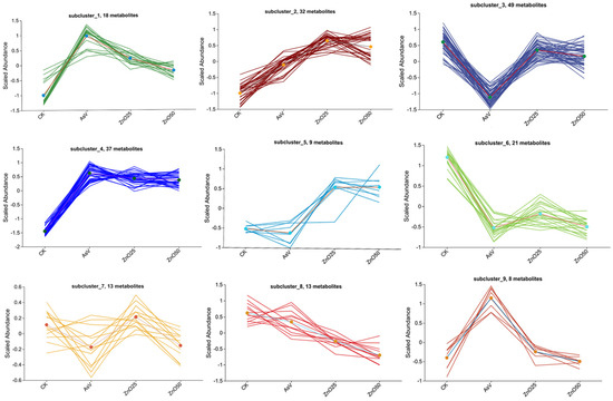 To elucidate the alterations and subsequent segregation of metabolites, a heatmap coupled with hierarchical clustering was employed. This approach identified the top 200 differentially regulated metabolites (Figure 3, Table S5). The heatmap delineated distinct clusters of metabolites across the four treatment groups, suggesting that metabolite profiles were dependent on the treatment. Notably, the ZnO25 and ZnO50 treatments exhibited a similar clustering pattern, indicating a comparable impact on the spatial distribution of synthesized metabolites in soybean roots. Given that certain metabolites exhibited analogous responses to stress, a k-means clustering algorithm was applied to further explore the accumulation patterns of DAMs in relation to the various treatments. These same 200 metabolites were subsequently categorized into nine sub-clusters based on their expression trends. The distribution of metabolites within these sub-clusters were varied, with sub-cluster 1 containing 18 metabolites, sub-cluster 2 containing 32, sub-cluster 3 containing 49, sub-cluster 4 containing 37, sub-cluster 5 containing 9, sub-cluster 6 containing 21, sub-cluster 7 containing 13, sub-cluster 8 containing 13, and sub-cluster 9 containing 8 metabolites, as depicted in Figure 4 and detailed in Table S5.