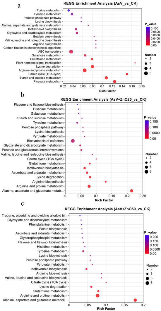 KEGG enrichment analysis of top 20 pathways of DRMs in the soybean roots: (a) AsV_vs_CK; (b) AsV + ZnO25_vs_CK; and (c) AsV + ZnO50_vs_CK. The size of the bubble in the figure represents the amount of enrichment to the metabolic concentration in the pathway, and the color of the bubble represents the size of the p-value of different enrichment significance. The treatment concentration was 25 µmol L−1 AsV and ZnONPs at concentrations of 25 µmol L−1 (2.035 mg L−1) and 50 µmol L−1 (4.07 mg L−1).