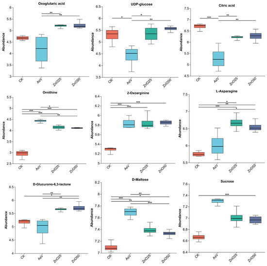 Box plots of relative abundance of some crucial metabolites in soybean roots under CK, AsV, AsV + ZnO25, and AsV + ZnO50 (n = 4). The X-axis represents the treatment name, and the Y-axis represents the average relative abundance of metabolites in the different treatment. The treatment concentration was 25 µmol L−1 AsV and ZnONPs at concentrations of 25 µmol L−1 (2.035 mg L−1) and 50 µmol L−1 (4.07 mg L−1). Asterisks (*), (**), and (***), indicate significant differences between the treatment at p < 0.05, p < 0.01 and p < 0.001 respectively.