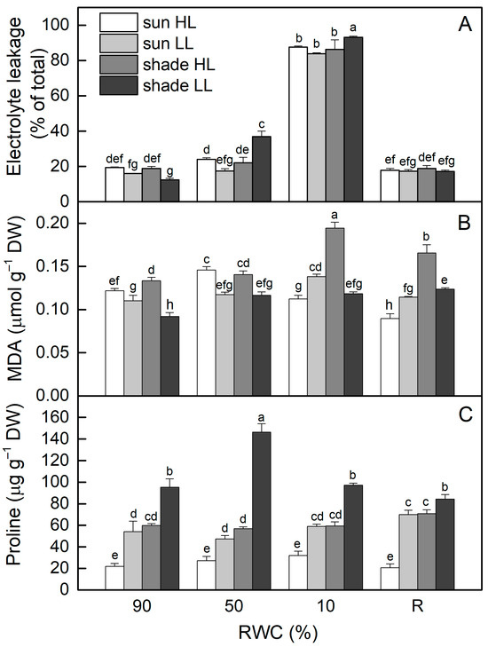The extent of electrolyte leakage (A) and malondialdehyde (MDA (B)) and proline content (C) in well-hydrated control plants (90% RWC), after moderate desiccation (50% RWC) and in dry leaves (10% RWC), as well as after 4 days of rehydration (R). Four plant groups are used in the experiments: sun plants exposed to high light (sun HL) or low light intensities (sun LL) and shade plants exposed to high light (shade HL) or low light intensities (shade LL). The data represent the mean of n = 10; the same letters within a graph indicate no significant differences assessed by Fisher’s LSD test (p ≤ 0.05) after performing an ANOVA.