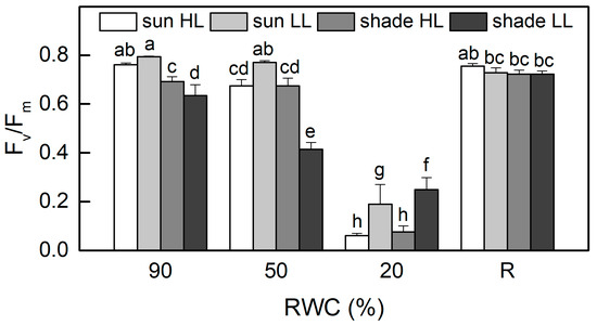 The values of the ratio Fv/Fm, as a measure of the maximum efficiency of PSII, were about 20% higher in well-hydrated sun HL plants compared to shade LL plants (p ≤ 0.05, Figure 3). When RWC declined to 50%, Fv/Fm was reduced by 10% in sun HL plants, while it decreased by 35% in shade LL plants, suggesting the higher sensitivity of shade plants. However, moderate dehydration of sun LL plants and especially of shade HL plants resulted in an increased quantum efficiency of PSII in a dark-adapted state. It should be noted that the photochemical activity of PSII was measured at 20% RWC, as it was completely inhibited in an air-dry state. The photochemical activity of PSII was significantly inhibited by severe desiccation but fully recovered after 4 days of rehydration.