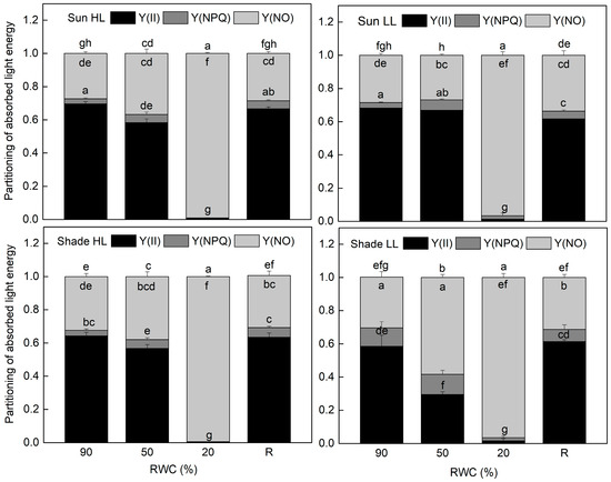 Allocation of absorbed light energy to PSII photochemistry and thus photosynthetic electron transport, Y(II) (black), non-photochemical fluorescence quenching, Y(NPQ) (gray), and non-regulated thermal energy dissipation, Y(NO) (light gray), in well-hydrated control plants (90% RWC), after moderate desiccation (50% RWC) and in dry leaves (10% RWC), as well as after 4 days of rehydration (R). Figure 2 describes plant groups used in the experiments. The data represent the mean of n = 10; the same letters within a graph indicate no significant differences assessed by Fisher’s LSD test (p ≤ 0.05) after performing an ANOVA.