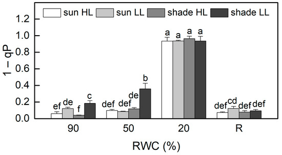 The results of the allocation of absorbed light energy show that the main part of excitation energy in well-hydrated plants is used for photochemistry (Figure 4). Similar to Fv/Fm, the quantum efficiency of PSII electron transport during illumination Y(II) was also higher in sun HL compared to shade LL plants. Exposure of control sun plants and especially of the shade plants to low and high light, respectively, increased the quantum yield of PSII. The main differences in the quantum efficiency of PSII between the investigated plant groups were observed under moderate dehydration. The most significant reduction in Y(II) values was determined in shade LL plants, which was accompanied by an almost two-fold increase in excitation pressure, estimated by the values of 1 − qP (Figure 5). Excitation pressure is suggested to be a major prerequisite for inducing efficient dissipation of excess excitation energy, thereby protecting the PSII reaction center from overexcitation. Indeed, the fraction of energy that is passively dissipated as heat and fluorescence, Y(NO), significantly increased in shade LL plants at 50% RWC (Figure 4). Despite some decline (about 15%), the quantum yield of PSII in moderately dehydrated sun HL plants was much higher compared to shade LL plants (p ≤ 0.05). In addition, the desiccation of shade HL and sun LL plants to 50% RWC resulted in increased Y(II) values compared to shade LL and sun HL plants. Furthermore, a slight increase in the quantum yield of non-photochemical quenching, Y(NPQ), was observed in all plant groups under moderate desiccation. Except in sun LL plants, some enhancement in Y(NO) was also detected. Severe desiccation of H. rhodopensis led to complete inhibition of PSII activity strong enhancement in excitation pressure, and the major part of absorbed light was emitted as Y(NO). But 4 days of rehydration were sufficient to fully restore the effectiveness of PSII.