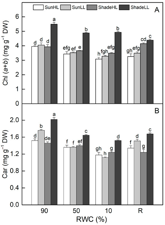 Changes in leaf chlorophyll [Chl (a + b)] (A) and carotenoid [Car] (B) content in well-hydrated control plants (90% RWC), after moderate desiccation (50% RWC) and in dry leaves (10% RWC), as well as after 4 days of rehydration (R). Figure 2 describes plant groups used in the experiments. The data represent the mean of n = 10; the same letters within a graph indicate no significant differences assessed by Fisher’s LSD test (p ≤ 0.05) after performing an ANOVA.