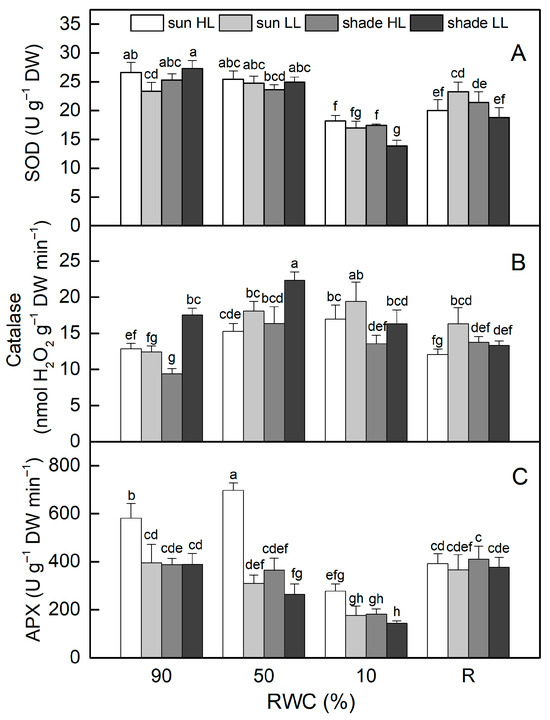 The results presented in Figure 2B show that, similar to EL, MDA content was lower in shade LL plants (about 25%) compared to sun HL plants (p ≤ 0.05). Treatment of control shade LL plants at high light resulted in a 45% enhancement in MDA, while its content decreased in sun LL plants. Dehydration of sun HL and shade LL plants increased MDA content (p ≤ 0.05), but no additional changes were detected in sun LL and shade HL plants. In the dry state (10% RWC), the most significant increase in MDA was observed in desiccated shade HL plants. MDA content remained higher than controls after rehydration of the latter and also in shade LL plants.