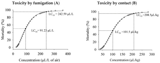 Toxicity by fumigation (A) and contact (B) of P. hispidinervum essential oil to adults of C. maculatus in cowpea beans.