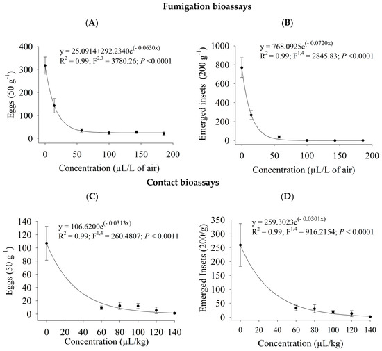 The oviposition and emergence rates of C. maculatus decreased significantly as the PHEO concentration augmented (p ≤ 0.001) in the fumigation and contact bioassays. The exponential model had the best fits to the data on oviposition and emergence rates in both application forms (Figure 2). Fumigating cowpea beans with PHEO at 14.3 to 185.7 µL/L of air substantially lowered oviposition (54.9 ± 9.8 to 93 ± 2.2%; Figure 2A) and progeny rates (64.9 ± 6.2 to 100 ± 0.00%; Figure 2B). Also, the contact bioassays with PHEO at 60 to 140 µL/kg caused considerable reductions in oviposition (88.5 ± 5.0 to 98.9 ± 1.1%; Figure 2C) and progeny rates (87.3 ± 3.9 to 99.1 ± 0.8%; Figure 2D).