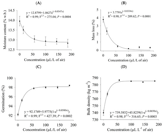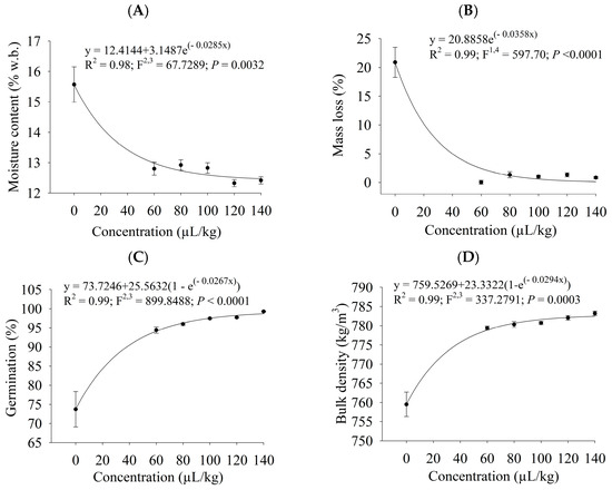 After being stored for 50 days, cowpea beans fumigated or sprayed with different concentrations of PHEO were subjected to quality analyses (moisture content, mass loss, germination, and bulk density). All quality features varied with the increase in the PHEO levels (p ≤ 0.0040). The exponential model had the best fits to the data on all considered variables (Figure 3 and Figure 4). Grain moisture content (Figure 3A and Figure 4A), mass loss (Figure 3B and Figure 4B), germination (Figure 3C and Figure 4C), and bulk density (Figure 3D and Figure 4D) varied as a function of the concentration of PHEO in the fumigation and contact bioassays. Grain quality was preserved when higher PHEO concentrations were used. In fumigated grains, quality did not change at levels higher than 57.1 µL/L of air, whereas in sprayed beans, it remained unaltered above 60 µL/kg.