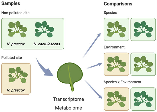 Three different comparisons of gene expression and metabolites were made: (i) a between-species comparison at the non-polluted site, i.e., N. praecox and N. caerulescens (labelled genotype), (ii) a between-environment comparison of N. praecox at the polluted and non-polluted site (labelled environment), and (iii) a species × environment comparison of N. praecox at the polluted site vs. N. caerulescens at the non-polluted site (labelled species × environment) (Figure 1).