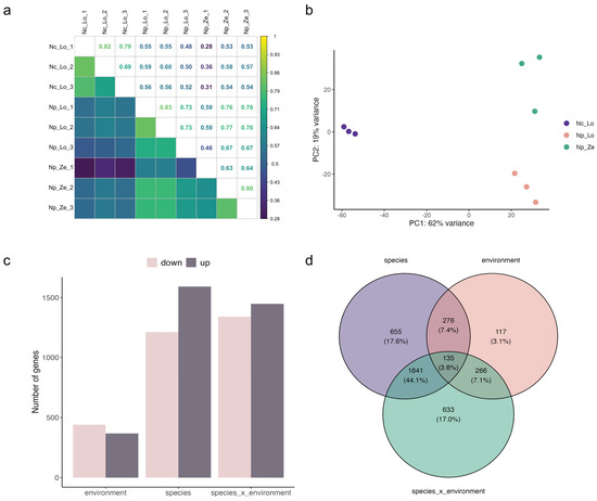 Transcriptome data of Noccaea caerulescens (Nc) and N. praecox (Np) from non-polluted (Lo) and polluted (Ze) sites. (a) Pearson correlation coefficient analysis, (b) PCA analysis, (c) number of differentially expressed genes (DEGs), and (d) Venn diagram of DEGs for species (Np_Lo vs. Nc_Lo), environment (Np_Ze vs. Np_Lo), and species_x_environment (Np_Ze vs. Nc_Lo) comparisons.