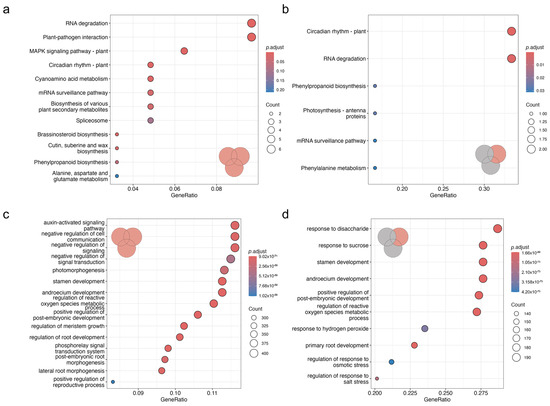 The enrichment analysis of KEGG functional pathways (a,b) and GO terms (c,d) among all DEGs (a,c) and DEGs in N. praecox grown in different environments (b,d). The inset Venn diagram depicts the differentially expressed genes used for pathway enrichment analysis, as depicted in Figure 2d. The colors of dots represent the adjusted p values and sizes represent the counts of transcripts in the category.