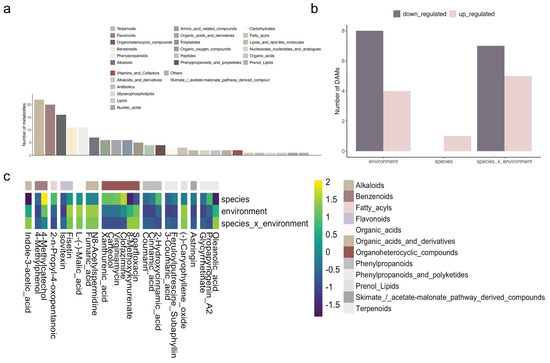 Metabolome analysis was performed to explore the metabolic response of N. praecox to metal stress and to compare it to N. caerulescens. All three groups were well distinguished by PCA analysis (Supplementary Figure S1). A total of 7252 metabolites were screened, with 1667 identified and 548 assigned to classes. Organoheterocyclic compounds, phenylpropanoids, and terpenoids comprised the groups with the highest number of metabolites identified (Figure 4a). Differential accumulation analysis revealed 26 differentially accumulated metabolites (DAMs) across all comparison groups. Specifically, in the environment and environment × species, there were 12 and 13 DAMs, respectively (Figure 4b). The number of DAMs was notably lower in species comparison, with no down-regulated DAMs and only one up-regulated DAM.