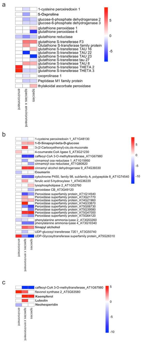 Heatmap of fold changes for differentially expressed genes and differentially accumulated metabolites (in bold) in (a) the glutathione metabolism pathway, (b) the phenylpropanoid biosynthesis pathway, and (c) the flavonoid biosynthesis pathway in for between-species (Np vs. Nc), environment (Ze vs. Lo), and species × environment (Np_Ze vs. Nc_Loc) comparisons. Colors represent log2 fold change: red—up-regulated; blue—down-regulated.