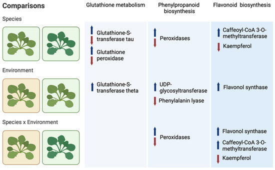 An integrated view of transcriptomic and metabolomic analysis identified several pathways that showed differences in expression levels between N. praecox and N. caerulescens when growing at the same site. As the plants were growing in the same environmental conditions and in close proximity, this emphasizes the importance of studies on different hyperaccumulator species, as differences can be observed even between phylogenetically very closely related species such as N. praecox and N. caerulescens [26]. In addition, several pathways showed up-regulation in N. praecox under polluted conditions. Among these up-regulated pathways, several are commonly associated with metal stress, such as glutathione metabolism, phenylpropanoid biosynthesis, and flavonoid biosynthesis [4,27,28].