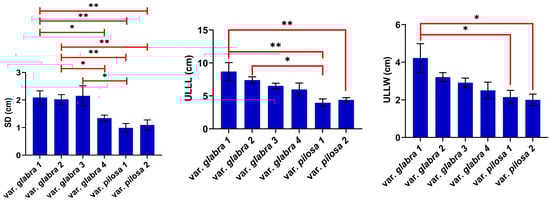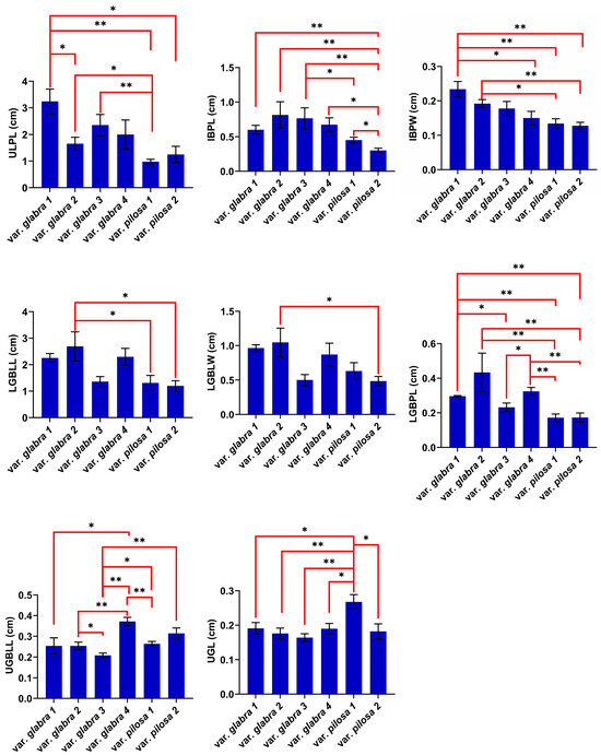 The mean values of the most significantly different characteristics (based on Table 1) between the pairs of the studied varieties are outlined in Figure 1. The most significant differences were observed in the stalk diameter (SD) of var. glabra 1 and var. glabra 2 vs. var. pilosa 1 and var. pilosa 2. The individuals of var. glabra 1 compared with those of var. pilosa 1 and var. pilosa 2 also showed p value ≤ 0.01 in leaf characteristics including the upper leaf lamina and petiole lengths (ULLL and ULPL, respectively), inflorescence bract petiole width (IBPW), and lower glomerule bract petiole length (LGBPL). At the same time, the inflorescence bract petiole length (IBPL) varied between population pairs of var. pilosa 2 and glabra (1, 2 and 3). And the upper glomerule bract lamina length (UGBLL) showed variations between population pairs of var. glabra (2 vs. 4), var. glabra (3 vs. 4), var. glabra 3 vs. var. pilosa 2, and var. glabra 4 vs. var. pilosa 1 (Figure 1 and Supplementary Tables S1 and S2).