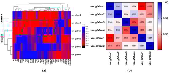 The correlation-based cluster analysis (outlined in Figure 2a) separated the six-studied Beta populations into two clusters. Cluster I included populations of var. glabra (1, 2, 3, and 4). On the other hand, Cluster II included populations of var. pilosa (1 and 2). The highest similarity value was recorded between populations of var. glabra (1 and 2), var. glabra (2 and 4), and populations of var. pilosa (1 and 2): 0.989, 0.988, and 0.987, respectively. The lowest similarity value was 0.97, recorded between populations var. glabra 1 and var. pilosa 1 (Figure 2b).