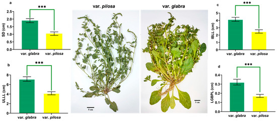 Using the 35 morphological characteristics studied, the student’s t-test and the Mann–Whitney test revealed significant differences in 17 characteristics between the two clusters. (Supplementary Tables S3 and S4). Cluster I, representing var. glabra, is morphologically distinguished by thick stalk diameters (SD), longer upper leaf lamina length (ULLL), longer lower glomerule bract petiole length (LGBPL), and longer inflorescence bract lamina length (IBLL) compared to the populations in Cluster II representing var. pilosa (Figure 3, Supplementary Tables S3 and S4).