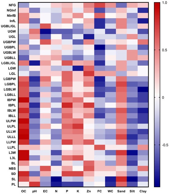 Spearman correlation heat map between the morphological characteristics of the Beta populations studied and the soil parameters. OC: organic carbon; pH potential hydrogen; EC: electrical conductivity; N: nitrogen; P: phosphorus; K: potassium; Zn: zinc; FC: field capacity; WC: water content.