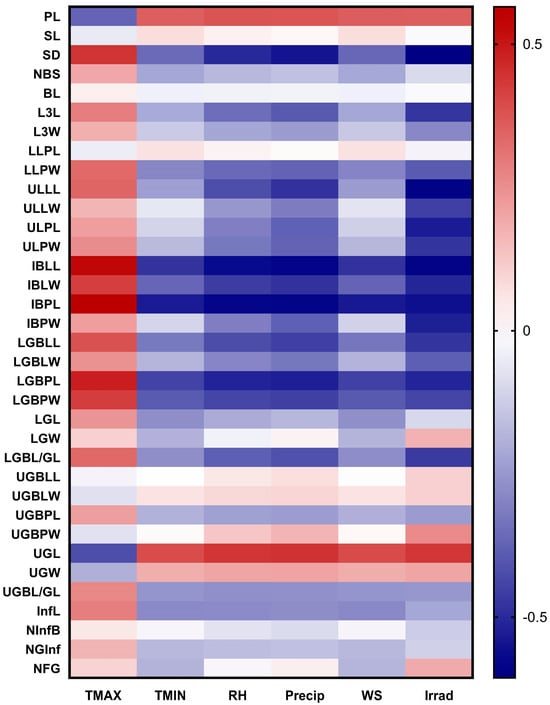 Pearson correlation heat map based on multiple linear regression analysis between the morphological characteristics of the Beta populations studied and climatic parameters. TMAX: maximum temperature; TMIN: minimum temperature; RH: relative humidity; Precip: precipitation; WS: wind speed; Irrad: solar irradiance.