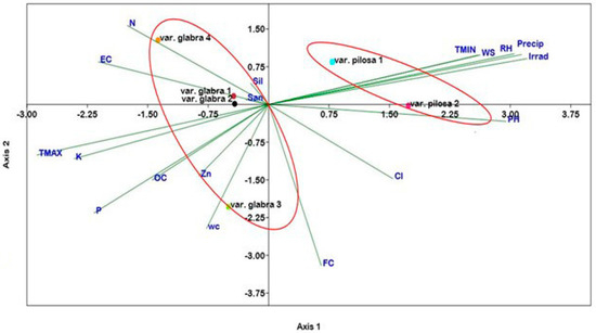 Table 3 outlined that relative humidity (%) and solar irradiance showed significant variation associated with var. glabra 1 and var. pilosa (1 and 2). Populations of var. glabra (2–4) only achieved the highest value of mean maximum temperature, while the increase in the rest of the data was for populations of var. pilosa (1 and 2).