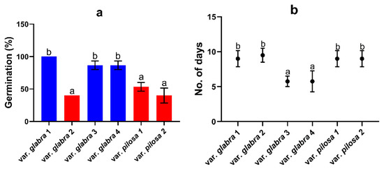 Our data showed that the percentage of seed germination varied significantly between populations (Figure 7a). The value was highest for the population of var. glabra 1 (100%) for about 10 days, while populations of var. glabra (3 and 4) remained for about 5 days to germinate 86.7% of the total seeds (Figure 7a,b). Populations of var. pilosa 2 and var. glabra 2 showed the lowest germination percentage of 40% for about 10 days after sowing. The morphological investigation of the juvenile individuals suggested maternal resemblance for the two studied varieties.