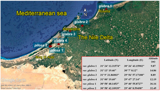 Six populations of sea beet (Beta vulgaris L. subsp. maritima (L.) Arcang.) were collected along six localities representing the core morphological diversity of the studied taxa within the Egyptian Mediterranean coastal region (Figure 8). Five full flowering samples were randomly selected from each population during the winter and spring of 2020–2022. According to previous studies, thirty-five quantitative traits of the macro-morphological characteristics (Table 4) including stem, leaves, flowers, inflorescences, and fruits were used to address inter-population and inter-variety variability [9,10,49]. The identified Beta taxa were based on previous taxonomic treatments [1,2,3,4,5,6,50].