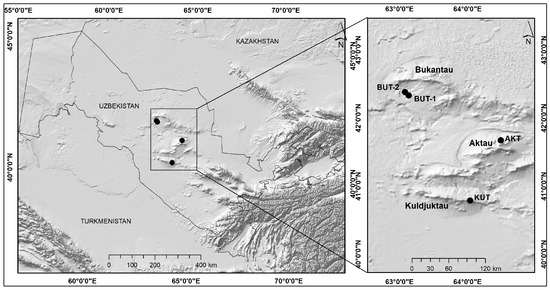 Study area. BUT-1, BUT-2 (Bukantau Mountains), KUT (Kuldzhuktau Mountains), and AKT (Aktau Mountains).