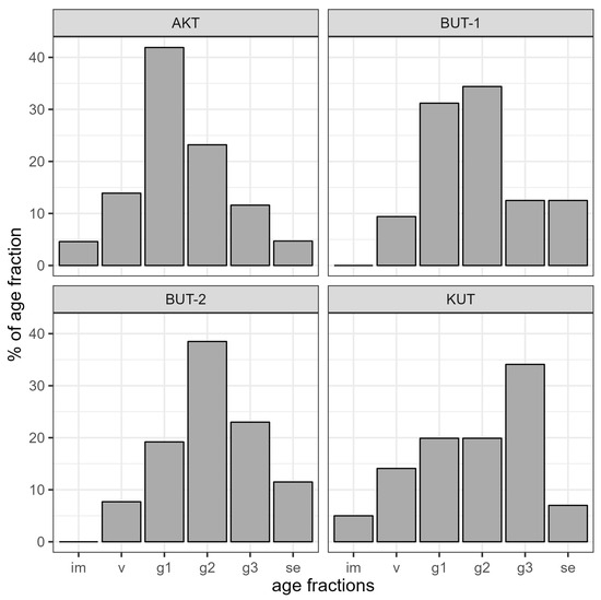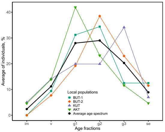 The results show that the age spectrum of the examined populations is not complete; in all coenopopulations (for details see Section 4.3), there is a lack of juvenile, and in BUT-1/BUT-2, also of immature individuals (Figure 3). In the latest local populations, the accumulation of the largest number of mature generative individuals was noted. They make up 34.4–38.5% of the total number of individuals. The ontogenetic spectrum of BUT-1/BUT-2 is centered with a predominance of mature generative individuals. In KUT, on the left side of the spectrum (im, v, g1) there is a smooth increase in individuals and their maximum value falls on old generative plants (34.1%). Unlike BUT-1/BUT-2, KUT and AKT are characterized by the presence of immature plants, although their proportion is insignificant (no more than 5.0%). The age spectrum of the KUT population is right-sided with a peak on old generative plants (g3), and the AKT population is left-sided, where the maximum values of individuals occur in young generative plants (g1). The average age spectrum of four coenopopulations shows that the number of individuals on the left side of the spectrum gradually increases and it reaches its maximum in the mature generative age of plants (g2) and then gradually decreases towards senescent plants (se) (Figure 4). A similar spectrum structure is typical for most shrubs in the arid zone.