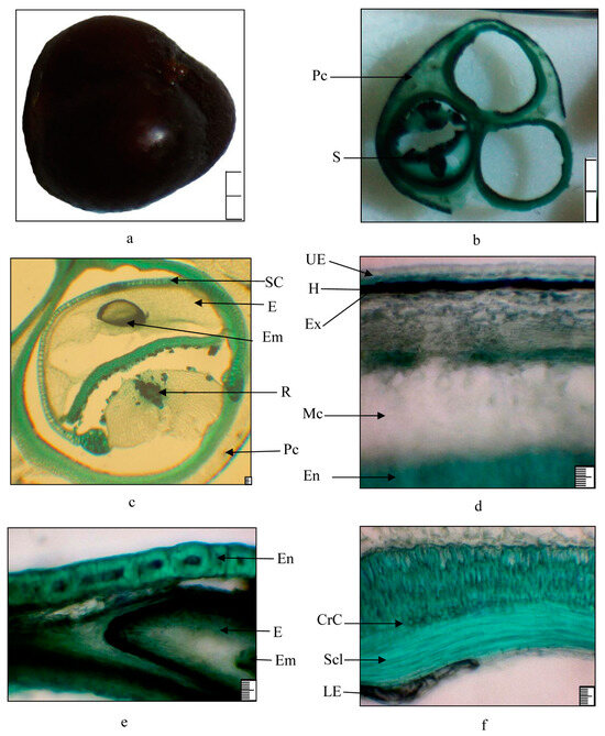Structure of the fruit of Rhamnus erythroxyloides subsp. sintenisii i: (a) general view; (b) cross section of the fruit; (c) seed; (d,e) fragments of the pericarp; (f) fragment of seeds. Legend: CrC—crystalline cells, E—endosperm, Em—embryo, En—endocarp, Ex—exocarp, H—hypodermis, LE—lower epidermis, Mc—mesocarp, Pc—pericarp, R—raphe, S—seed, SC—seed coat, Scl—sclerenchyma, UE—upper epidermis; (a,b) 20 mm, (c–f) 100 µm.