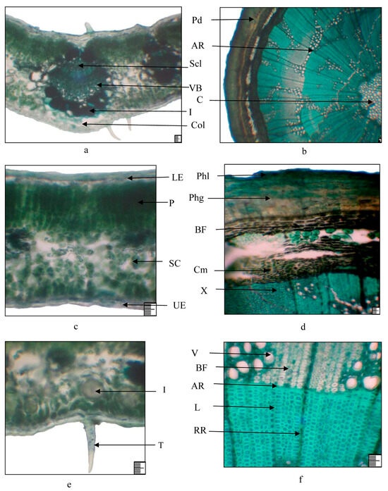 Leaf and branch structure of Rhamnus erythroxyloides subsp. sintenisii i: (a,c,e) leaf; (b,d,f) branch. (a) Main vein; (c,e) mesophyll; (b) general view of a cross section of a branch; (d) bark fragment; (f) fragment of xylem. Legend: AR—annual growth rings, BF—bast fibers, C—core, Cm—cambium, Col—collenchyma, I—idioblast, L—libriform, LE—lower epidermis, P—palisade, Pd—periderm, Phg—phellogen, Phl—phellem, RR—radial ray, SC—spongy cells, Scl—sclerenchyma, T—trichome, V—vessel, VB—vascular bundle, UE—upper epidermis, X—xylem; (a–f) 100 µm.