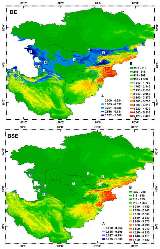 Potential ranges of Rh. erythroxyloides subsp. sintenisii based on BE and BSE models: A—assessment of the degree of distribution of the species; B—height above sea level (m). According to potential hotspots, Rh. erythroxyloides subsp. sintenisii is distributed across the northernmost part of the Elburz Ridge (1) (Iran), partially extending to the southwestern slopes of the Turkmen–Khorasan Mountains—Kopet Dag (2), the Small and Large Balkhan Mountains (3), and the Krasnovodsk Hills (4) (Turkmenistan). Its range also includes the expansive Mangyshlak Peninsula (5) and the northwestern slopes of the Karatau Ridge (6) (Kazakhstan), certain remnant mountains of the Kyzylkum Desert (7), the extensive Fergana Valley (8) (Uzbekistan), and the northern and western slopes of the Kyrgyz Ridge (9) (Kyrgyzstan). However, based on the BSE distribution model, the occurrence of this species in the Karatau Ridge (6), Fergana Valley (8), and Kyrgyz Ridge (9) is unlikely.