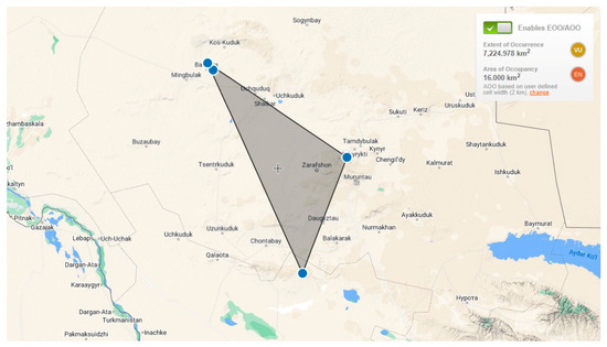 As a relic of the Tertiary period, the current state of local populations of Rh. erythroxyloides subsp. sintenisii was assessed according to IUCN criteria. Currently, there are four local populations, clearly separated from each other. Although in recent years rare species have been regularly assessed in Uzbekistan based on the requirements of the IUCN Red List [22,23,24], this rare subspecies for Uzbekistan has not previously been included in the International Red List or national Red Book, so an assessment based on IUCN categories and criteria is being carried out for the first time. To date, a global assessment of the conservation status of the subspecies is impossible due to the lack of accurate data for this period on the state of populations of Rh. erythroxyloides subsp. sintenisii in Turkmenistan, Kazakhstan, and Iran, so we limited ourselves to conduct a regional assessment work. According to Geocat analysis, the distribution area of the subspecies in Uzbekistan (EOO) is 7224 km2 (Figure 8), and this indicator can serve as the basis for its compliance with the vulnerable (VU) category. However, the small area of local populations and the total number of individuals in them shows that the subspecies clearly corresponds to the endangered (EN) category. This is also confirmed by geospatial assessment: the total area (AOO) occupied by the population of the subspecies does not exceed 16 km2. The total number of individuals in the subpopulations is about 1000. The subpopulation in Aktau (about 500 individuals) has the largest proportion of individuals, while in Kuljuktau there are about 300 individuals, and in Bukantau (two subpopulations) about 200 individuals are registered, of which more than 90% are mature individuals. Analysis of general indicators in all subpopulations of Rh. erythroxyloides subsp. sintenisii shows that the AOO is less than 500 km2, there are no more than five localities, less than 2500 mature individuals in the population, and more than 20% risk of extinction in the next 100 years. All this indicates that this subspecies is on the verge of extinction ((EN) B 2ab (i, ii, iii, iv) + C1 + E) and the status is confirmed. Factors threatening the population (2.3 livestock and horse breeding, 5.2 collection of above-ground stems, 7.3 other ecosystem modifications [25]) are known, repeated, and not eliminated.
