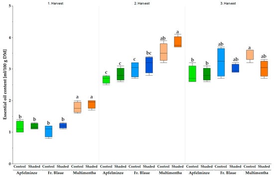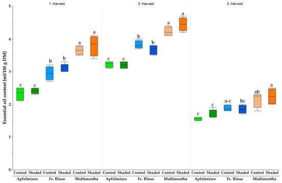 | ‘Multimentha’ | Shaded | 3 | 791.5 ± 121.2 a–c | 143.4 ± 17.8 b | 18.2 ± 1.1 b |