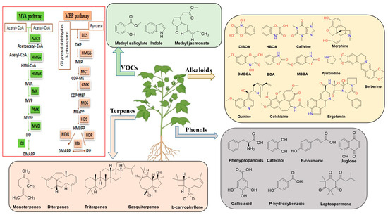 Plants released secondary metabolites, which may have affected the growth and development of nearby plant species. When organic matter breaks down in plants, secondary metabolites are produced and released, which may be reached by precipitation and influence interactions between soil microbes and plants [29]. Phytochemical compounds may be divided into defense compounds and signal substances [30]. Signal substances facilitate allelobiosis, while defense compounds, i.e., allelochemicals, facilitate allelopathy. A maximum of the secondary metabolites is made up of various organic compounds, which may be volatile or non-volatile. The phytochemicals include alkaloids, glycosides, organic acids, phenols, and terpeniods [30]; these compounds are important for regulating the rhizosphere microbiota, proper plant growth, and defense systems [31]. It is essential to understand what makes a plant invasion successful [8,32]. Research in the past showed that to improve their effectiveness, invasive plants produce secondary metabolites [33]. These secondary metabolites have influenced the cycling of nutrients, native plants, and soil microbe [34]. To mediate these effects, both direct and indirect routes can be used. Observing how chemicals from invasive plants affect plant competition—by limiting the growth of nearby plants—provides a straightforward way to understand their effects [35]. According to [36], the growth of the native plants is inhibited immediately by the chemical phytotoxin (2)-catechin emitted from the roots of the invading Centaurea maculosa. Also, the seeds of native plants are prevented from germination due to the secondary metabolites produced by invaded invasive plant species [37]. It is clear that the increase in competitiveness of the invasive plant may be due to the inhibition of these direct impacts [34]. Invasive plant species release some phytochemicals, such as alkaloids, phenols, terpeniods, and volatile compounds, which indirectly affect the competition. By changing the cycling nutrients—specifically, soil inorganic and organic nutrients flows and pools—these metabolites might unintentionally promote the growth of invaders [38]. Additionally, invasive plants may compete indirectly by using natural soil microbe. Plant pathogens and symbionts, along with secondary metabolites, have the ability to change the soil’s microbial community [39]. These microbes ensure the survival of plants in challenging environments [40]. The reason behind the success of invasive plant invasion over the native plant is the presence of secondary metabolites. Secondary compounds include many substances like growth inhibitors, poisons, and allelopathic chemicals [41]. The following are several secondary metabolites that are mostly present in invasive plants and can harm native plant species.