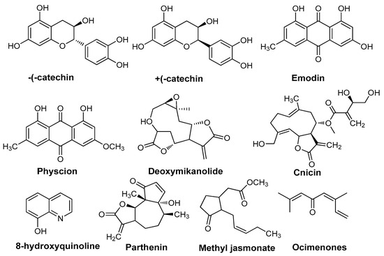 One of the most economically damaging alien invaders in North America is the Centaurea species, which is suspected of displacing native species Catechins quickly through allelopathic mechanisms [77]. (−)-catechin (Figure 2) from C. maculosa (Asteraceae), often known as spotted knapweed, was found to be a phytotoxic root exudate, while (+)-catechin (Figure 2) exhibited antibacterial qualities. The idea that C. maculosa invasiveness is enabled by (−)-catechin release is supported by the abundance of racemic catechin found in soil extracts from fields where the plant has invaded. In soils sustaining invasive C. maculosa in North America, the natural content of (−)-catechin was more than double that in Europe. The findings offer compelling evidence that C. maculosa root exudation of (−)-catechin is responsible for the displacement of native plant communities, at least partially. Additionally, they used an integration of ecological, physiological, biochemical, cellular, and genetic techniques to show the allelopathic effects of C. maculosa. The findings demonstrated that natural field soil conditions inhibited the growth and germination of native species [78]. The natural content of 8-hydroxyquinoline (8HQ, Figure 2), an allelochemical that has never before been described as a natural product, varies biogeographically from C. diffusa (Asteraceae) root exudates [79]. It has larger phytotoxic effects on North American grass species than on Eurasian grass species, and it is at least three times more concentrated in soils invaded by C. diffusa in North America than in the native Eurasian soils of this plant. Moreover, regardless of the biogeographical origin of the soil biota, experimental communities constructed from North American plant species are considerably more vulnerable to invasion by C. diffusa than communities constructed from Eurasian species. More so than Eurasian soils, North American soil biota sterilization inhibited C. diffusa, suggesting that the latter may be encouraged to invade North American soils. Since North American plants have not developed a natural resistance to 8-HQ, it is possible that Eurasian plants and soil microbes have. This suggests a remarkable potential for evolutionary compatibility and homeostasis among plants within natural communities, as well as a mechanism by which exotic weeds ruin these communities. C. maculosa (Asteraceae) was shown to have a phytotoxic chemical called cnicin (Figure 2), a sesquiterpene lactone (spotted knapweed) [80]. It can hinder larval growth and development [81]. M. micrantha (Asteraceae), commonly known as Mile-a-Minute, is one of the top 100 worst invasive alien species in the world. Deoxymikanolide (Figure 2) and other sesquiterpene lactones were identified from this plant [82], revealing a high level of phytotoxicity to the family Brassica (Brassicaceae). These compounds might significantly impact how well the weed invades [83]. Throughout the plant’s life cycle in a natural population, ocimenones (Figure 2), the predominant terpenes in the essential oils of the leaves and reproductive structures of Tagetes minuta L. (Asteraceae) were investigated. Ocimenones’ phytotoxic impact on germination was assessed. According to bioassays, T. minuta fruit material and pure ocimenones slowed and prevented coexisting species from germinating. Regarding T. minuta’s chemical ecology, a connection between allelopathy, biosynthesis, catabolism, and terpene release is suggested [84]. In field conditions, it was discovered that methyl jasmonate (Figure 2), a trace amount exuded by sagebrush (Artemisia tridentate ssp. tridentate, Asteraceae), inhibited Nicotiana attenuata seed germination [85,86]. Anthraquinones: in a recirculating system, the root exudates of Polygonum sachalinense F. Schmidt ex Maxim. (Polygonaceae) considerably slowed down the growth of lettuce seedlings. Emodin (Figure 2) and physcion’s (Figure 2) inhibitory effects on the growth of seedlings of various tested plant species were demonstrated using TLC agar plates [87]. Emodin and physcion were present in the rhizome, roots, and fallen leaves in comparatively high proportions. This plant community’s soil also contains emodin, with autumnal effective concentrations being the highest. These powerful allelopathic compounds, known as anthraquinones, are therefore likely responsible for the interference seen [16]. The plant parthenium yields a wide range of allelochemicals, which can be classified into many chemical classes. A thorough description of these kinds of allelochemicals emitted by parthenium weed and its residues was provided by [88]. Perthenin (Figure 2) is a sesquiterpene lactone secondary metabolite released from parthenium plants, and this compound affects other plant species [89]. Besides perthenin, parthenium plants also produced a variety of hydrophilic phenols comprising ferulic, anicic, fumaric, vanillic, and caffeic acids. These phenolic compounds exhibit phytotoxicity in water extracts from parthenium species [90]. According to [91], several additional sesquiterpene lactones, flavonoids, and tannins are possible allelochemicals produced by parthenium plant species.