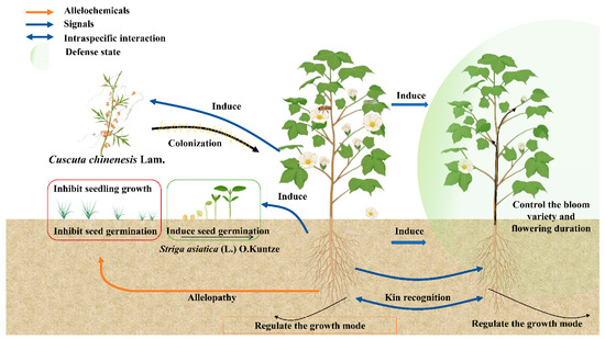 Plants of the same species have the ability to poison surrounding individuals by producing autotoxic allelochemicals [53]. This phenomenon inside the natural ecosystem is self-thinning. Furthermore, plants have the ability to suppress their own seed germination and seedling growth in order to control the population in both space and time. This allows them to avoid internal competition and increase their geographic range [139]. Autotoxicity is also found in agroecosystems [140] and medicinal plants [141], resulting in a drop in output, inadequate seedling growth, and lower-quality leaves. Chinese fir roots release autotoxic compounds that inhibit the plant’s ability to regenerate [43]. Kin recognition is the ability of plants to recognize and react to their neighbors thanks to intraspecific allelobiosis [142], as shown in Figure 3. Plants identify their relations by subterranean chemical signals, which helps them control community competitiveness and growth [143]. According to evolutionary theory, kin selection will favor individuals with the same genes, providing a higher chance of survival in a changing environment when relatives are recognized [144]. Furthermore, to ensure that outcrossing plants can effectively complete pollination, Brassica para L. var nipposinica (L. H. Bailey) Hanelt’s root exudates can control both aboveground flowering time and flowering duration [53]. Chemical signals from plants that evaporate into the atmosphere also trigger chemical defense responses in nearby plants or the evaporating plants themselves, regulating population density [145]. Higher levels of tetradecane are released by Holotrichia parallela-infested maize roots. In order to create protective jasmonic acid and BX in the roots of maize plants, Motschulsky sends a chemical signal to nearby uninfected plants [146].