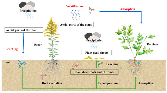 Illustrates the transfer of allelopathic compounds from a donor plant to a receiver plant through various pathways, including leaching, volatilization, root exudation, and decomposition. Compounds are released into the soil via precipitation or root exudation, volatilized into the atmosphere, or deposited through decomposing plant material, where they can be absorbed by neighboring plants. This chemical exchange plays an important role in shaping plant interactions, influencing competitive dynamics and ecosystem structure.
