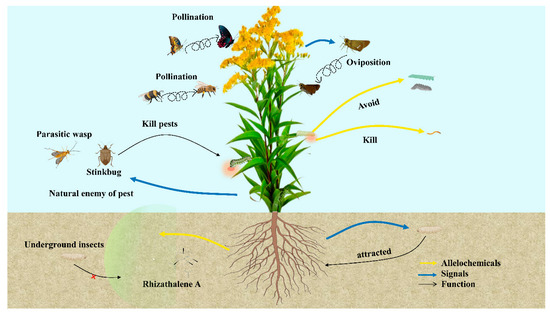 When the leaves of A. adenophora were extracted in ethyl acetate, the compounds were identified using gas chromatography-mass spectrometry. 5,6-dihydroxycadinan-3-ene-2,7-dione was found to be most effective against Meloidogyne incognita [174]. The essential oils called precocenes from A. conyzoides affect the digestive system, and the anti-juvenile hormones of the oil caused abnormalities in metamorphosis [175]. According to [176], the oil extracts also exhibited genotypic or phenotypic abnormalities in the immature Aedes, Anopheles, and Culex species. Also, the secondary metabolites in this invasive plant showed promising results against many insect pests, such as Helicoverpa armigera, Phytophthora megakarya, Rhipicephalus microplus, Tribolium castaneum, Diaphania hyalinata, and Plutella xylostella [177]. The methanolic extracts of M. micrantha significantly repelled Oriental fruit flies in the field [135,178]. According to [179], Plutella xylostella, Phyllotretast riolata, and Phaedon brassicae showed oviposition deterrence when volatile oils of M. micrantha were used at a dose of 5–10 µL/plant. The antecedent effects of crude extract of M. micrantha on l–2 instars of Pieris rapae and 2–3 instars of Plutella xylostella were 80% and 70%, respectively [180]. Allelochemicals such as mikanin, eupalitin, eupafolin, (3,4′,5,7-tetra-hydroxy 6- methoxyflavone 3-O-β-D-glucopyranoside, luteolin, 3,5-di-O-caffeoylquinic acid n-butyl ester, and 3,4-di-O-caffeoylquinic acid n-butyl ester were identified from M. micrantha [105]. β-cubebene, terpinolene, β-caryophyllene, 1imonene, β-farnesene, ocimene, δcadino1, γ-terpinene, ethylnaphthalene, a-caryophy11ene, β-cadinene + isocaryophyllene, δ-bisabolene, and β-bisabolene+cubebo1 were determined as the main compounds in essential oil of M. micrantha [180]. The volatile oil of Chromolaena odoratum is a strong oviposition deterrent of striped flea beetle (Phyllotreta striolata) and diamondback moth (DBM) (Plutella xylostella) at dose of 10–20 µL/plant [181]. The alcohol extract and its chloroform fraction exhibited strong repellent effects (80%) against DBM [182]. The alcohol extracts of C. odoratum effectively deterred the oviposition of DBM, and the active compounds were identified as chalcones and flavonols [183].