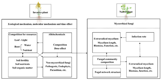 Invasive plants can affect native plants through a variety of ecological mechanisms. At present, relevant research mainly focuses on species competition, soil nutrient changes, and allelopathy. As shown in Table 6, invasive plants tend to compete for resources (light and nutrients, etc.). For example, Solanum carolinense has a strong ability to reproduce asexually and can spread rapidly [216]. Invasive plants can also inhibit photosynthesis in native plants; reduced photosynthates may inhibit native plant mycorrhizal fungal infection [217] (Figure 6). Invasive plants tend to have strong nutrient competitiveness and a large amount of root exudates [218]. Invasive plants can also improve and enhance soil nutrients through litter and root exudates, forming a positive feedback loop between plant and soil [219]. This process reduces the infection rate of mycorrhizal fungi in native plants (such as Solidago decurrens and Andropogon gerardii) and alters the community composition of mycorrhizal fungi [220] (Figure 6). Invasive plants can also direct affect native plant mycorrhizal fungi through allelopathy [221] (Figure 6). Allelopathic substances produced by invasive plants (such as flavonoids and glucosides, etc.) inhibit the germination, growth, and infection of mycorrhizal fungi spores, thereby inhibiting the growth of native plants dependent on these fungi [222]. These allelopathic substances may also inhibit mycorrhizal fungal infection by inhibiting the growth of native plants, thereby reducing the carbon supply of plants to mycorrhizal fungi [223]. In addition, allelopathic substances secreted by foreign plants may also affect the non-mycorrhizal fungi of native plants, thereby indirectly affecting the mycorrhizal fungi of native plants (Figure 6). In fact, changes in native plant mycorrhizal fungi may result from a combination of mechanisms [224]. The influence of different invasive plants on native plant mycorrhizal fungi may be different, and the response of native plant mycorrhizal fungi to each mechanism may also be different, resulting in varied trends in the influence of foreign plant invasion on different native mycorrhizal fungi.