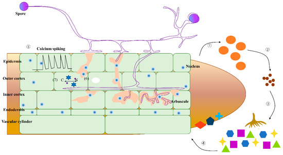 The symbiotic relationship between plants and mycorrhizal fungi is a complex signal transduction process. In the creation of arbuscular mycorrhizal fungi, signal exchange between the root system and AMF is the first step [231]. According to [232], strigolactones are signaling molecules secreted by the root system (e.g., Lotus japonicus) that not only encourage the AMF spore germination but also enhance the chance of hyphae contact with the root system. Mycorrhizal fungi secreted an array of signaling molecules (i.e., mycorrhizal factors, like LCOs, CO4/CO5, and PsMiSSP10b). As shown in Figure 7, corresponding receptors in the root system recognize these molecules and activate the calcium ion signaling pathway, which in turn produces an infection line and initiates the mycorrhizal fungi’s infection process [233]. For example, short chitosan oligosaccharide (CO4/CO5) and lipochitosaccharide (LCOs) secreted by rice AMF are recognized by heteromers of LysM receptor-like kinases in rice, including OsMYR1/OsLYK2 and OsCERK1 [234]. LCOs and CO4/CO5 factors released by AMF are recognized by NFR1/LYK3H in leguminous plants [235]. Mycorrhizal fungi also produce plant cell wall decomposition enzymes (PCWDEs) by producing small secreted proteins (MiSSPs) to recognize hosts [127], disrupting the cell wall of the host plant and removing the “barrier” to the establishment of symbiotic relationships. The important relationship between the mycorrhizal fungi and roots lies in the exchange of nutrients and carbon (lipids and sugars) [234], which comprises a sequence of lipid synthases and nutrient transporters. Mitogen-activated protein kinases (MAPKs) are key pillars in AMF and plant signaling. According to [236], it is the STR transporters that carry fatty acids through alfalfa Medicago truncatula. Invasive plant species inhibit native plant mycorrhizal fungal infections by changing these transport enzymes, ultimately impacting native plant growth. For example, lipid synthase (FatM and RAM2) mutations in alfalfa roots, which control the supply of lipids needed by mycorrhizal fungi in plants, were found to reduce the infection rate of AMF [236].