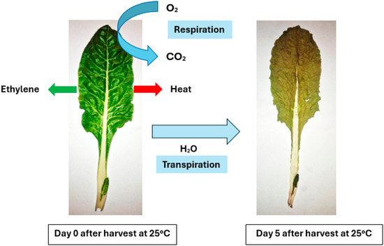 The availability of leafy greens in the fresh produce market is limited because they are highly perishable [3]. Leafy vegetables are characterized by higher metabolic processes that accelerate quality deterioration [4]. They have higher respiration, ethylene production, and evapotranspiration rates, which result in several physiological and biochemical responses including chlorophyll degradation, loss of texture, moisture loss, as well as conversion of organic acids to sugars. Higher metabolic processes have been reported to reduce the quality of fresh produce, such as fruits and non-leafy vegetables [5]. The metabolism is even higher in leafy vegetables because of the higher surface area-to-volume ratio.