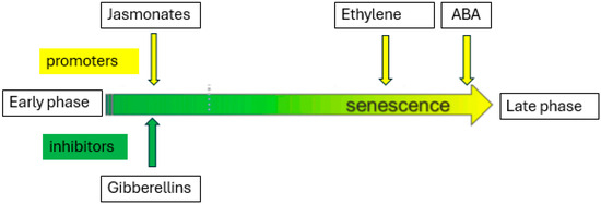 The senescence of leafy vegetables is also hormonally regulated (Figure 3). Just like in all other crops, the plant growth regulators are synthesized during the active growth period of leafy vegetables, and they are translocated into areas where they are actively functioning. Lipton [9] revealed that the senescence phase is closely linked to the levels and interactions of hormones, like cytokinin, gibberellin, ABA, and ethylene, and the water status. The plant hormones play different roles during preharvest and postharvest in leafy vegetables. Therefore, some hormones like jasmonates, ethylene, and abscisic acid (ABA) participate in inducing senescence in leafy greens [72]. This is associated with the concentrations of these hormones which increase as leaf tissues mature. While gibberellins inhibit the induction of senescence, as they become abundant at the early stages of leaf development [72].