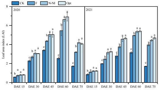 Leaf area indices of potato plants under different N management practices from 2020 to 2021. DAE: days after emergence. The column and bar in the figure represent the LAI mean and standard deviation for each treatment. Data with different lowercase letters indicate significant differences between treatments at the same period within the same year (p < 0.05).