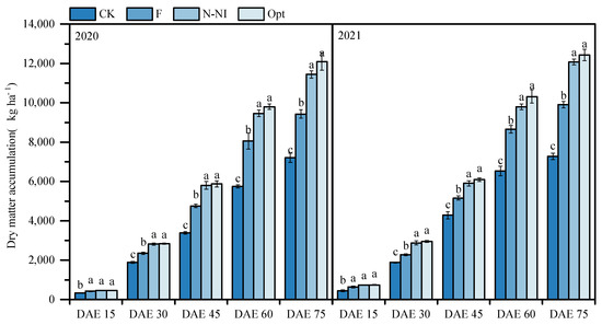 Effects of different nitrogen management practices on dry matter accumulation in potato (kg ha−1). DAE: days after emergence. The column and bar in the figure represent the DW mean and standard deviation for each treatment. Data with different lowercase letters indicate significant differences between treatments at the same period within the same year (p < 0.05).