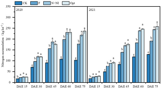 Effects of different N management practices on N accumulation in potato plants (kg ha−1). DAE: days after emergence. The column and bar in the figure represent the N accumulation mean and standard deviation for each treatment. Data with different lowercase letters indicate significant differences between treatments at the same period within the same year (p < 0.05).